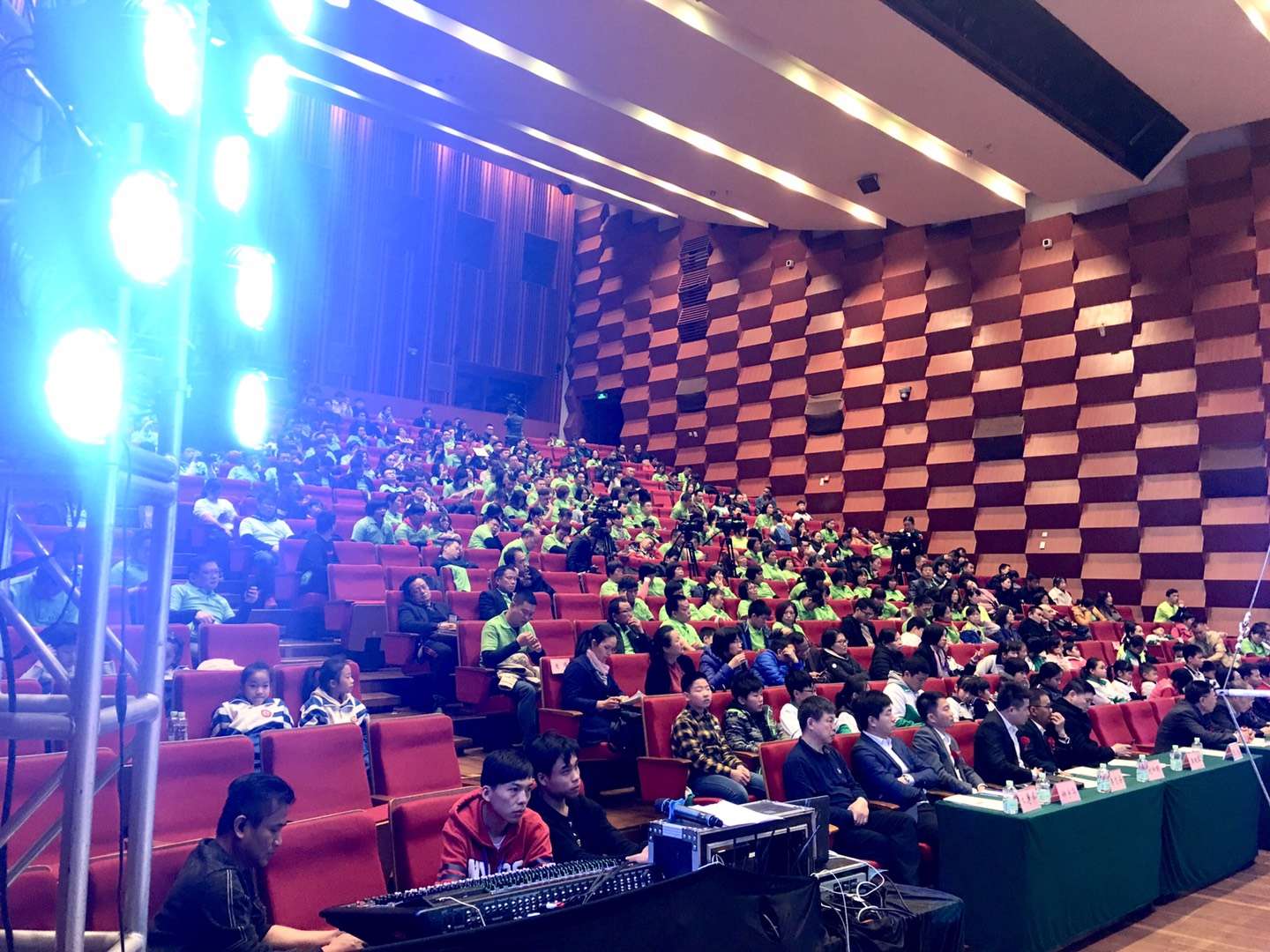 通常在舞臺后區(qū)做一面燈光墻,面向觀眾置于演員表演區(qū)后面。地面可以設置搖頭光束燈、大功率激光燈,以一定的仰角面向觀眾席后上方投射光束,也可用窄光束AC筒燈向舞臺兩側前方投射光束,并做跑燈變化。燈墻的燈具可以選擇窄光束LED投光換色燈向舞臺表演區(qū)正投,或使用窄光束LED投光換色燈在燈光墻里面向舞臺兩側投射,產生具有沖擊力的舞臺視覺效果。
